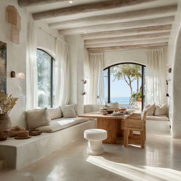 Un espacio que respira calma, luz y materialidad. Este salón comedor combina la estética mediterránea con una sensibilidad contemporánea, donde cada elemento ha sido seleccionado para crear una atmósfera serena y envolvente. El diseño boutique se manifiesta en la elección de materiales nobles —madera natural, piedra suave, cerámica artesanal— y en una paleta cromática que equilibra tonos arena, blanco y la presencia de la madera
